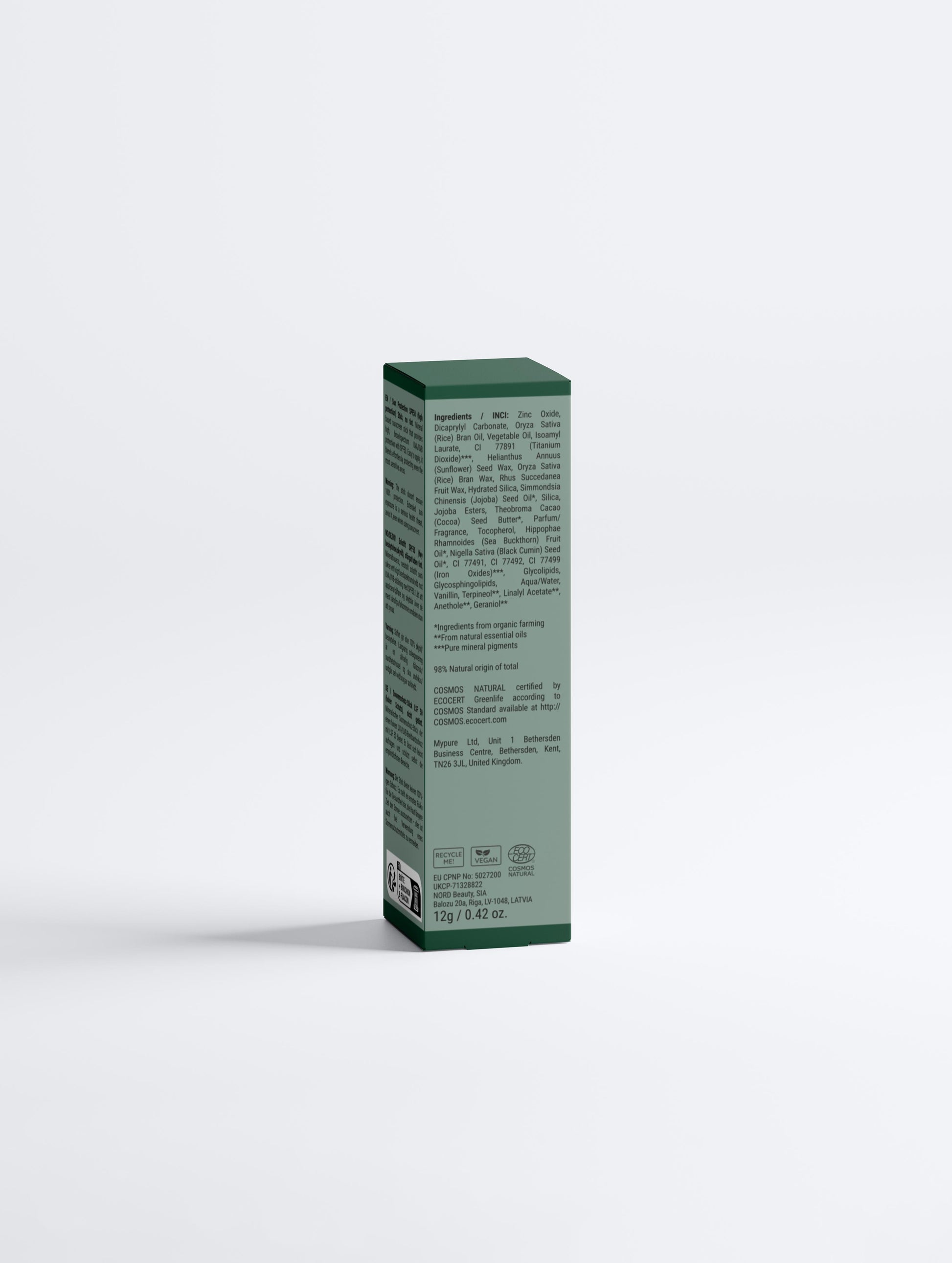 Zinc Oxide, Dicaprylyl Carbonate, Oryza Sativa (Rice) Bran Oil, Vegetable Oil, Isoamyl Laurate, CI 77891 (Titanium Dioxide)③, Helianthus Annuus (Sunflower) Seed Wax, Oryza Sativa (Rice) Bran Wax, Rhus Succedanea Fruit Wax, Hydrated Silica, Simmondsia Chinensis (Jojoba) Seed Oil①, Silica, Jojoba Esters, Theobroma Cacao (Cocoa) Seed Butter①, Parfum/Fragrance, Tocopherol, Hippophae Rhamnoides (Sea Buckthorn) Fruit Oil①, Nigella Sativa (Black Cumin) Seed Oil①, CI 77491, CI 77492, CI 77499 (Iron Oxides)③, Glycolipids, Glycosphingolipids, Aqua/Water, Vanillin, Terpineol②, Linalyl Acetate②, Anethole②, Geraniol②